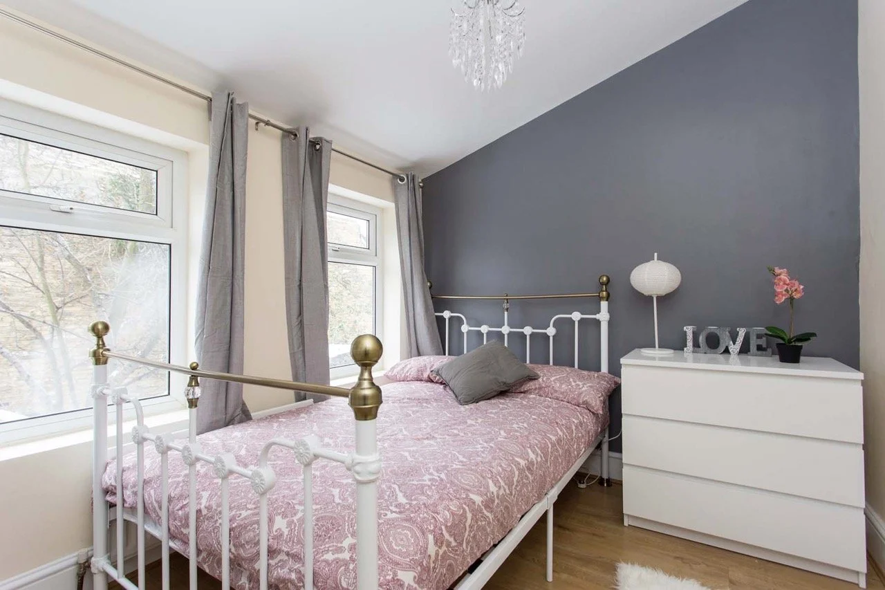 Each room is beautifully decorated with a feature grey wall, and white furniture. The property is on a quiet residential street, and just a 3 min walk away from Waitrose. The property has a beautiful communal lounge with an LCD Smart TV.